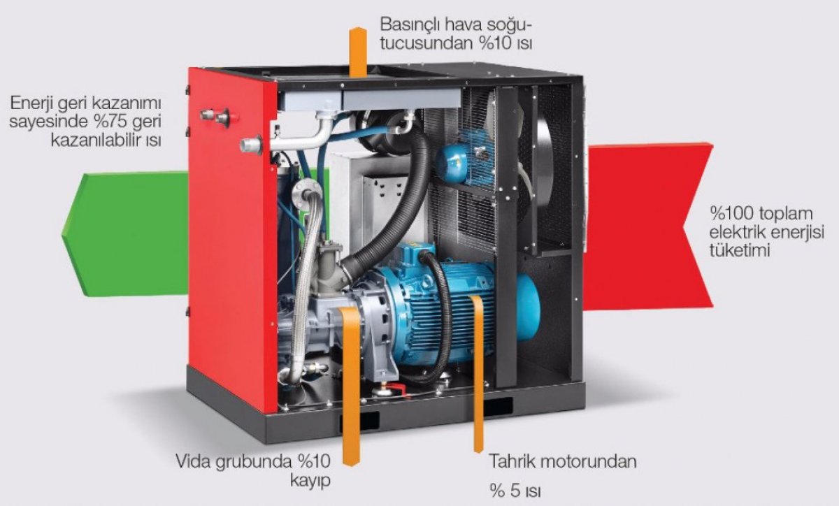 Su soğutmalı ve hava soğutmalı kompresörlerde, yağ devresi bir yağ/su ısı eşanjörüyle önceden soğutulur. Böylece su, yağ sıcaklığını geri kazanmak için bir sıvı taşıma ortamı haline gelir. Bu işlemden or-taya çıkan sıcak su, radyatörleri ya da su kazanlarını ısıtmakta, içme suyunu ya da sıcak su musluğundan gelen suyu önceden ısıtmakta veya diğer endüstriyel uygulamalarda kullanılabilir. Enerji geri kazanım seçeneği, sürekli olarak basınçlı su akışını ısıtan bir ısı eşanjörünü yağ devresi üzerine entegre eder. Sistem otomatik olarak ayarlanır ve sınırlı su soğutma kapasitesinin olduğu durumlarda, kompresörün standart soğutma sistemi çalışır ve enerji geri kazanım cihazına destek olur. Enerji geri kazanım seçeneği, hiçbir bakım ya da elektrik tüketimi gerektirmeyen fakat enerji maliyetlerinizde önemli kazançlar sunan basit bir mekanik sistemdir.
